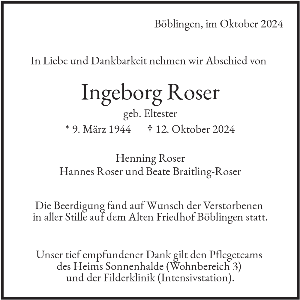 Hier finden Sie alle Traueranzeigen aus der Zeitung, die bisher für Ingeborg Roser erschienen sind. Weitere Traueranzeigen, die in der Zeitung erscheinen, werden hier ebenfalls aufgelistet