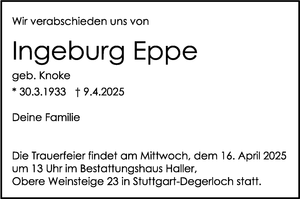 Hier finden Sie alle Traueranzeigen aus der Zeitung, die bisher für Ingeburg Eppe erschienen sind. Weitere Traueranzeigen, die in der Zeitung erscheinen, werden hier ebenfalls aufgelistet