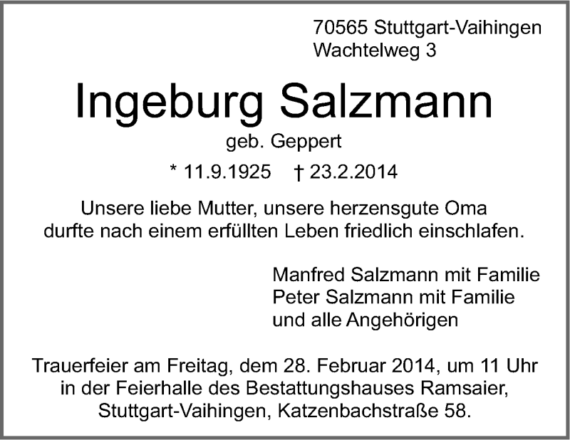Hier finden Sie alle Traueranzeigen aus der Zeitung, die bisher für Ingeburg Salzmann erschienen sind. Weitere Traueranzeigen, die in der Zeitung erscheinen, werden hier ebenfalls aufgelistet