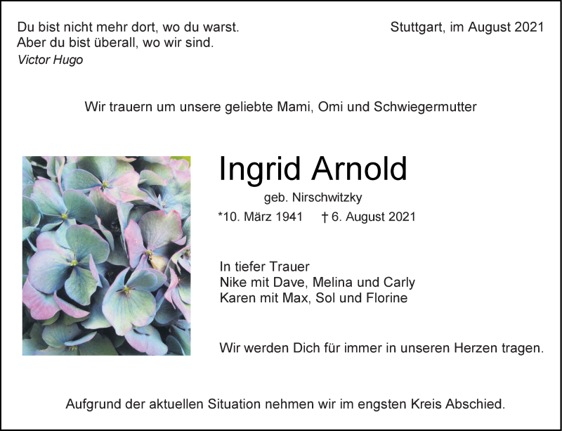 Hier finden Sie alle Traueranzeigen aus der Zeitung, die bisher für Ingrid Arnold erschienen sind. Weitere Traueranzeigen, die in der Zeitung erscheinen, werden hier ebenfalls aufgelistet