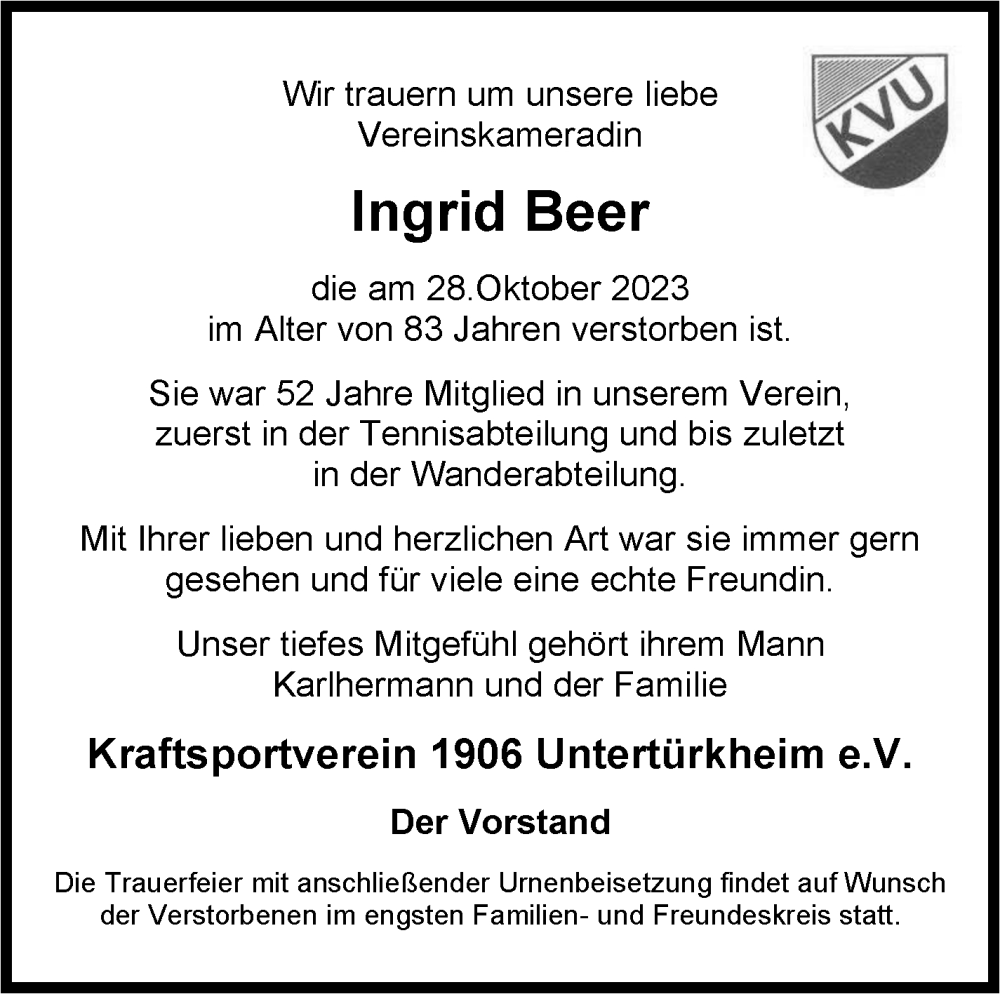 Hier finden Sie alle Traueranzeigen aus der Zeitung, die bisher für Ingrid Beer erschienen sind. Weitere Traueranzeigen, die in der Zeitung erscheinen, werden hier ebenfalls aufgelistet