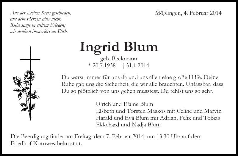 Hier finden Sie alle Traueranzeigen aus der Zeitung, die bisher für Ingrid Blum erschienen sind. Weitere Traueranzeigen, die in der Zeitung erscheinen, werden hier ebenfalls aufgelistet