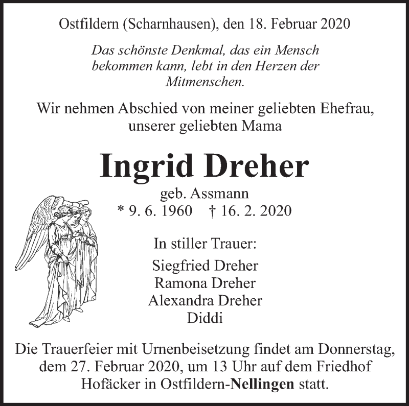 Hier finden Sie alle Traueranzeigen aus der Zeitung, die bisher für Ingrid Dreher erschienen sind. Weitere Traueranzeigen, die in der Zeitung erscheinen, werden hier ebenfalls aufgelistet