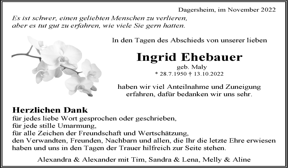 Hier finden Sie alle Traueranzeigen aus der Zeitung, die bisher für Ingrid Ehebauer erschienen sind. Weitere Traueranzeigen, die in der Zeitung erscheinen, werden hier ebenfalls aufgelistet
