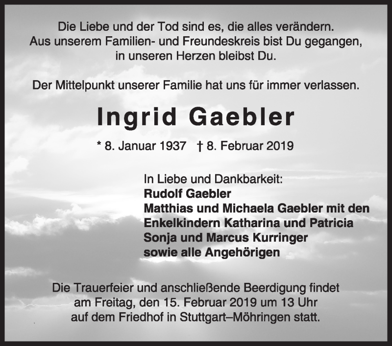 Hier finden Sie alle Traueranzeigen aus der Zeitung, die bisher für Ingrid Gaebler erschienen sind. Weitere Traueranzeigen, die in der Zeitung erscheinen, werden hier ebenfalls aufgelistet