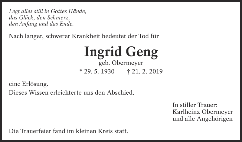 Hier finden Sie alle Traueranzeigen aus der Zeitung, die bisher für Ingrid Geng erschienen sind. Weitere Traueranzeigen, die in der Zeitung erscheinen, werden hier ebenfalls aufgelistet