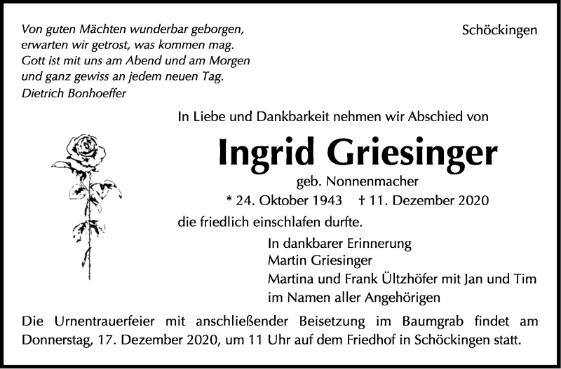 Hier finden Sie alle Traueranzeigen aus der Zeitung, die bisher für Ingrid Griesinger erschienen sind. Weitere Traueranzeigen, die in der Zeitung erscheinen, werden hier ebenfalls aufgelistet