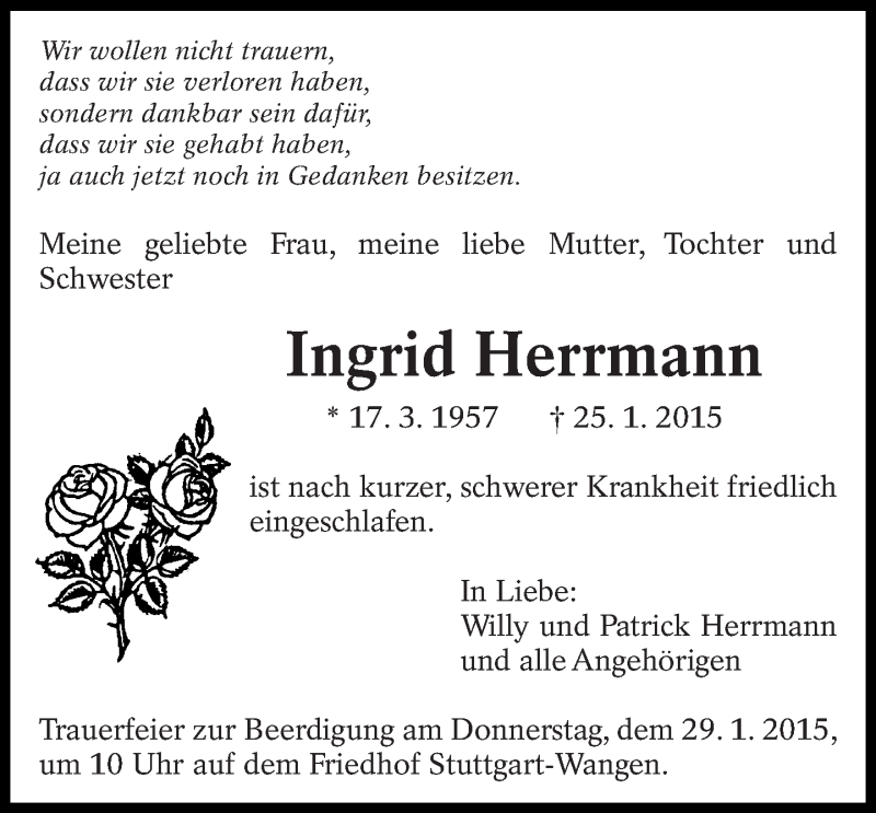 Hier finden Sie alle Traueranzeigen aus der Zeitung, die bisher für Ingrid Herrmann erschienen sind. Weitere Traueranzeigen, die in der Zeitung erscheinen, werden hier ebenfalls aufgelistet