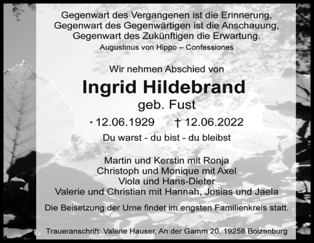 Hier finden Sie alle Traueranzeigen aus der Zeitung, die bisher für Ingrid Hildebrand erschienen sind. Weitere Traueranzeigen, die in der Zeitung erscheinen, werden hier ebenfalls aufgelistet