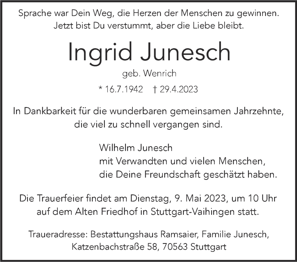 Hier finden Sie alle Traueranzeigen aus der Zeitung, die bisher für Ingrid Junesch erschienen sind. Weitere Traueranzeigen, die in der Zeitung erscheinen, werden hier ebenfalls aufgelistet