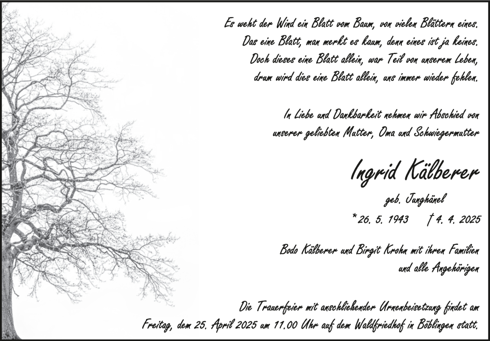 Hier finden Sie alle Traueranzeigen aus der Zeitung, die bisher für Ingrid Kälberer erschienen sind. Weitere Traueranzeigen, die in der Zeitung erscheinen, werden hier ebenfalls aufgelistet