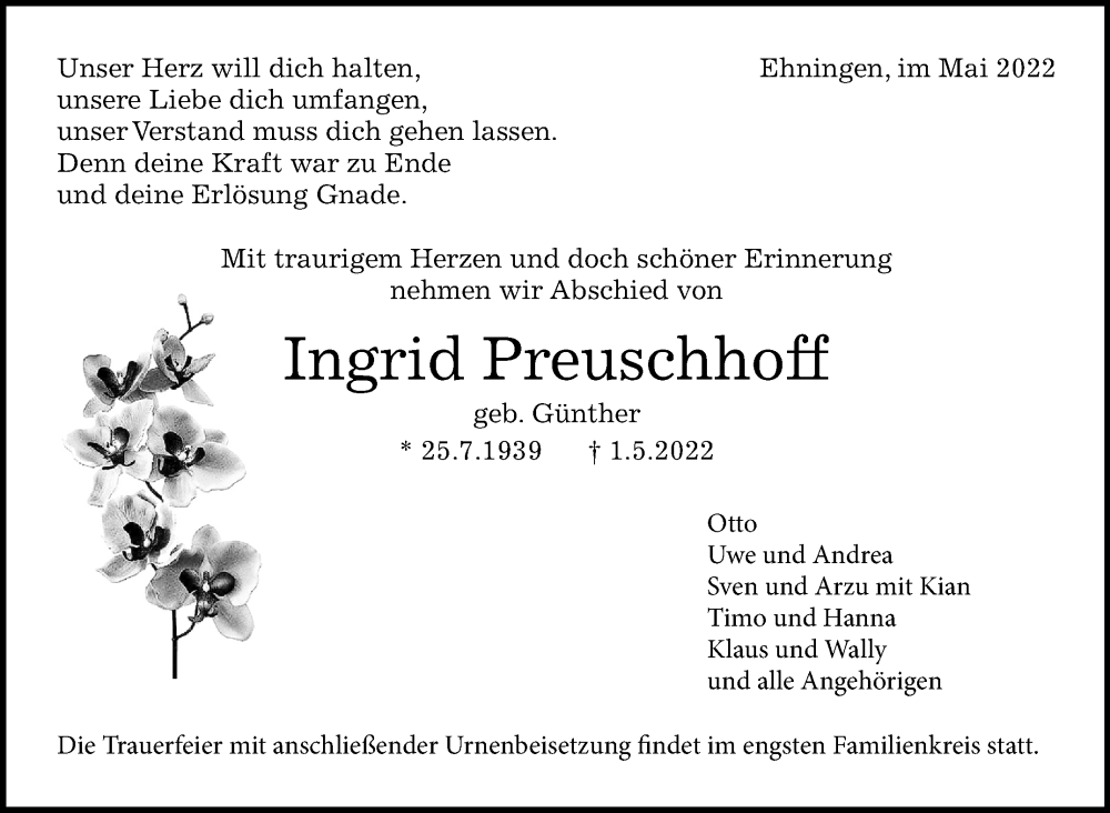Hier finden Sie alle Traueranzeigen aus der Zeitung, die bisher für Ingrid Preuschhoff erschienen sind. Weitere Traueranzeigen, die in der Zeitung erscheinen, werden hier ebenfalls aufgelistet