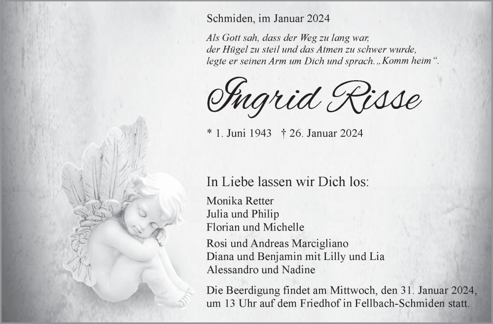 Hier finden Sie alle Traueranzeigen aus der Zeitung, die bisher für Ingrid Risse erschienen sind. Weitere Traueranzeigen, die in der Zeitung erscheinen, werden hier ebenfalls aufgelistet