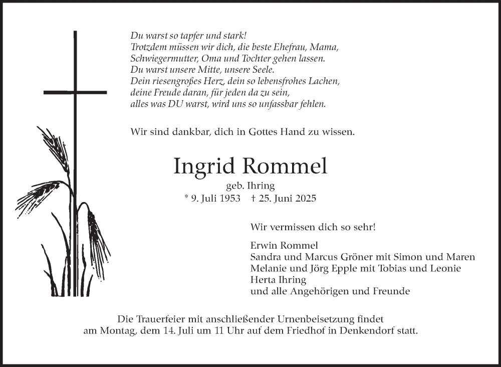 Hier finden Sie alle Traueranzeigen aus der Zeitung, die bisher für Ingrid Rommel erschienen sind. Weitere Traueranzeigen, die in der Zeitung erscheinen, werden hier ebenfalls aufgelistet