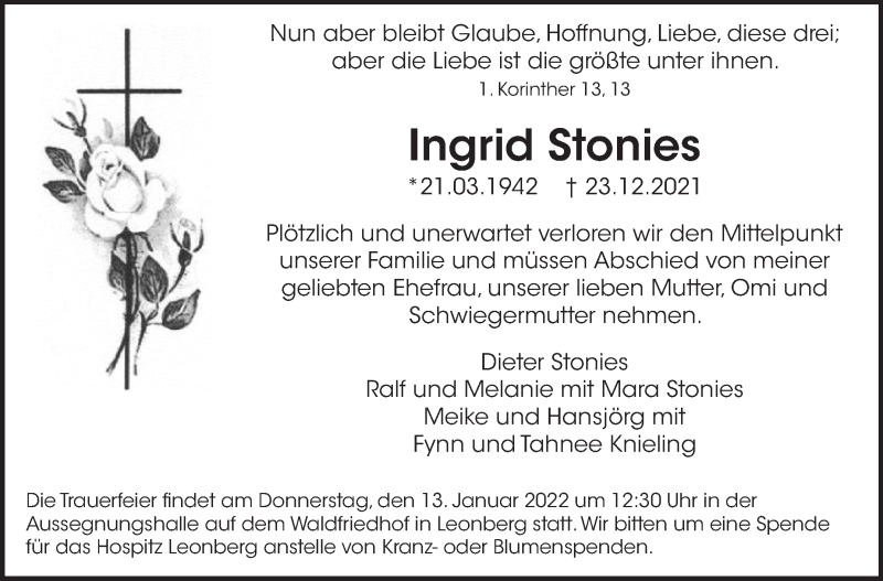 Hier finden Sie alle Traueranzeigen aus der Zeitung, die bisher für Ingrid Stonies erschienen sind. Weitere Traueranzeigen, die in der Zeitung erscheinen, werden hier ebenfalls aufgelistet