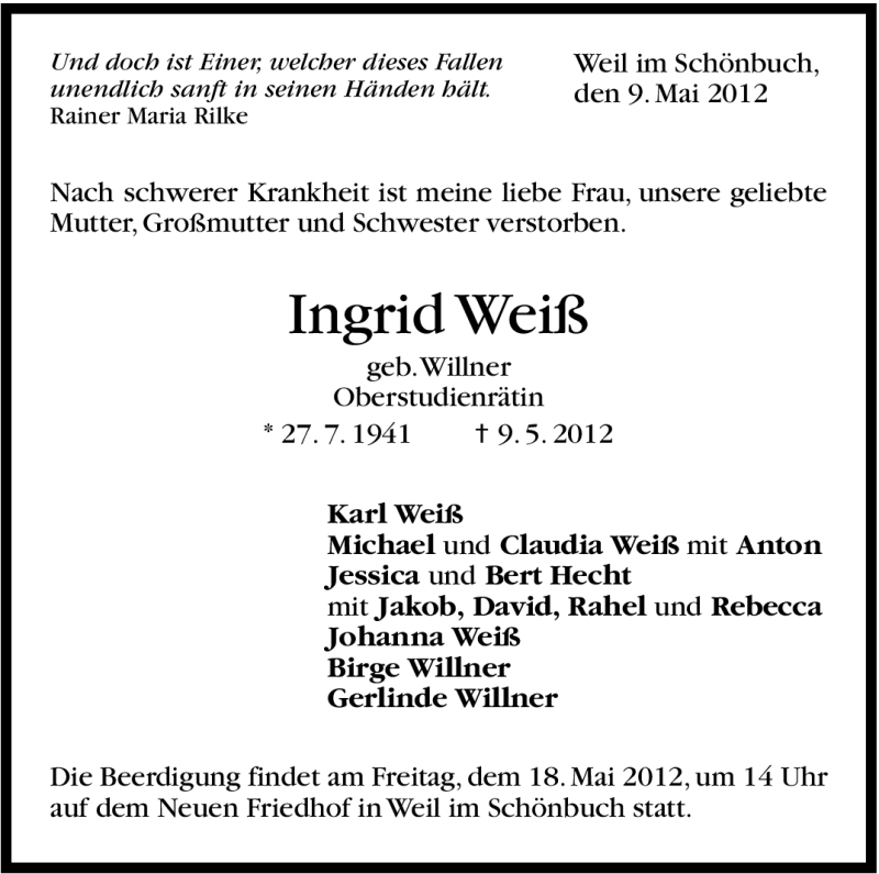 Hier finden Sie alle Traueranzeigen aus der Zeitung, die bisher für Ingrid Weiß erschienen sind. Weitere Traueranzeigen, die in der Zeitung erscheinen, werden hier ebenfalls aufgelistet