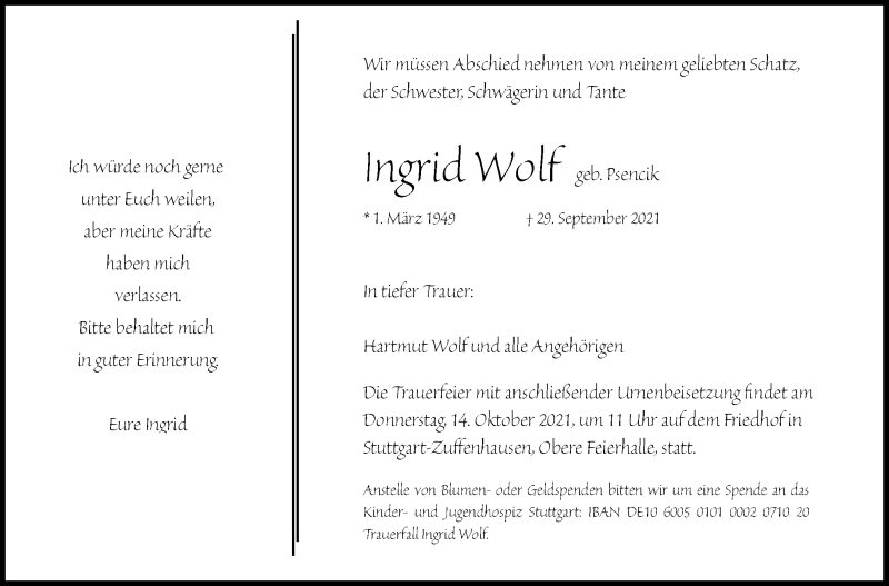 Hier finden Sie alle Traueranzeigen aus der Zeitung, die bisher für Ingrid Wolf erschienen sind. Weitere Traueranzeigen, die in der Zeitung erscheinen, werden hier ebenfalls aufgelistet