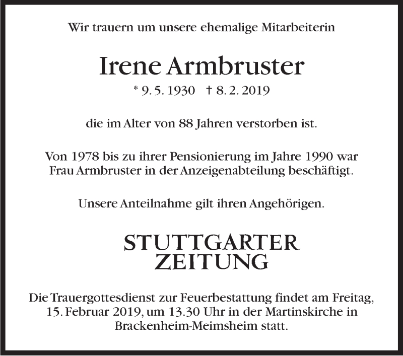 Hier finden Sie alle Traueranzeigen aus der Zeitung, die bisher für Irene Armbruster erschienen sind. Weitere Traueranzeigen, die in der Zeitung erscheinen, werden hier ebenfalls aufgelistet
