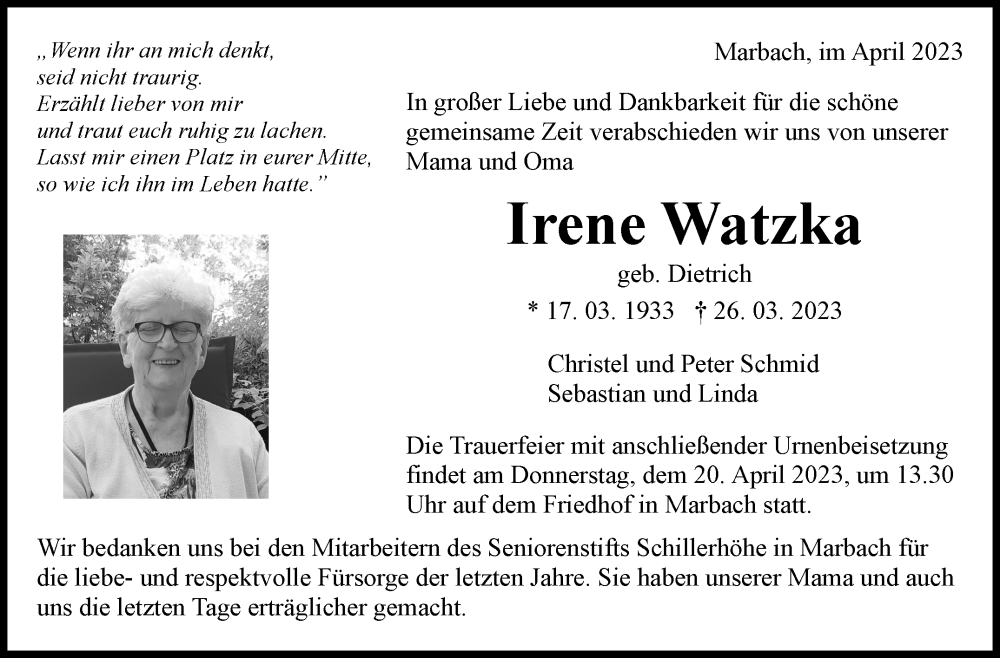 Hier finden Sie alle Traueranzeigen aus der Zeitung, die bisher für Irene Watzka erschienen sind. Weitere Traueranzeigen, die in der Zeitung erscheinen, werden hier ebenfalls aufgelistet