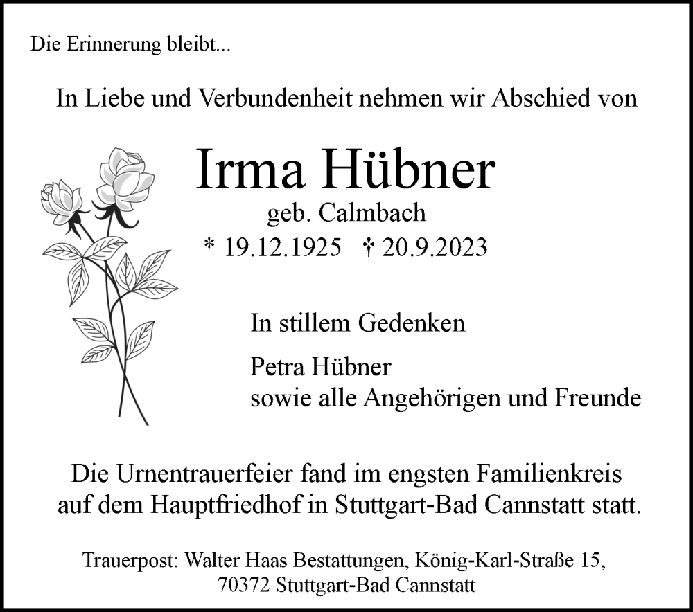 Hier finden Sie alle Traueranzeigen aus der Zeitung, die bisher für Irma Hübner erschienen sind. Weitere Traueranzeigen, die in der Zeitung erscheinen, werden hier ebenfalls aufgelistet