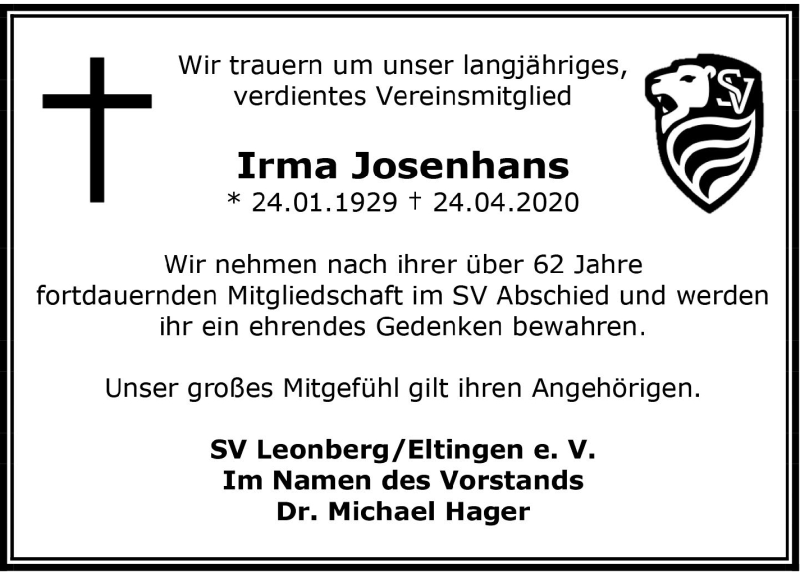 Hier finden Sie alle Traueranzeigen aus der Zeitung, die bisher für Irma Josenhans erschienen sind. Weitere Traueranzeigen, die in der Zeitung erscheinen, werden hier ebenfalls aufgelistet