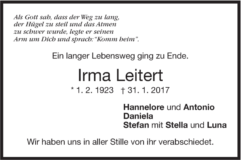 Hier finden Sie alle Traueranzeigen aus der Zeitung, die bisher für Irma Leitert erschienen sind. Weitere Traueranzeigen, die in der Zeitung erscheinen, werden hier ebenfalls aufgelistet