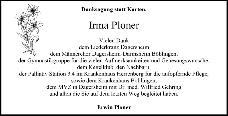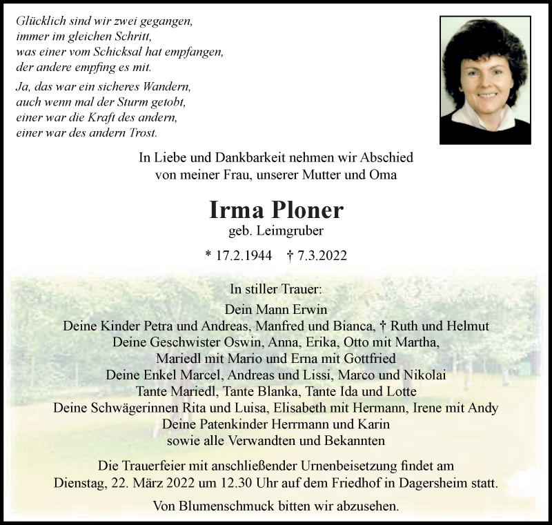 Hier finden Sie alle Traueranzeigen aus der Zeitung, die bisher für Irma Ploner erschienen sind. Weitere Traueranzeigen, die in der Zeitung erscheinen, werden hier ebenfalls aufgelistet