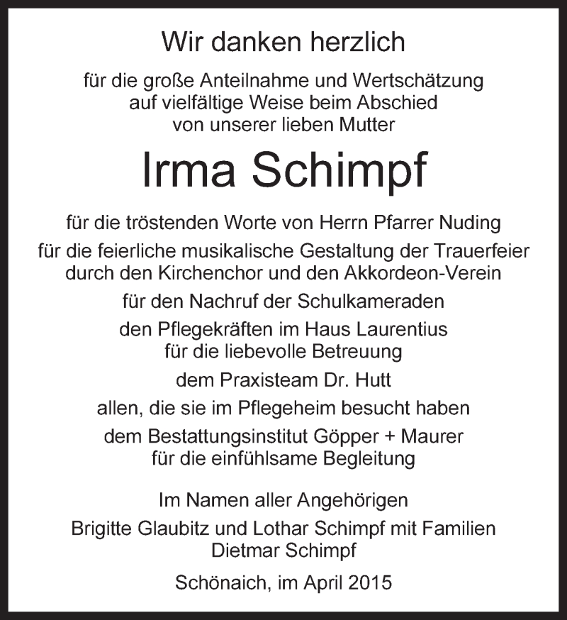 Hier finden Sie alle Traueranzeigen aus der Zeitung, die bisher für Irma Schimpf erschienen sind. Weitere Traueranzeigen, die in der Zeitung erscheinen, werden hier ebenfalls aufgelistet