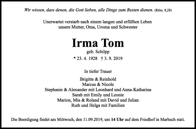 Hier finden Sie alle Traueranzeigen aus der Zeitung, die bisher für Irma Tom erschienen sind. Weitere Traueranzeigen, die in der Zeitung erscheinen, werden hier ebenfalls aufgelistet