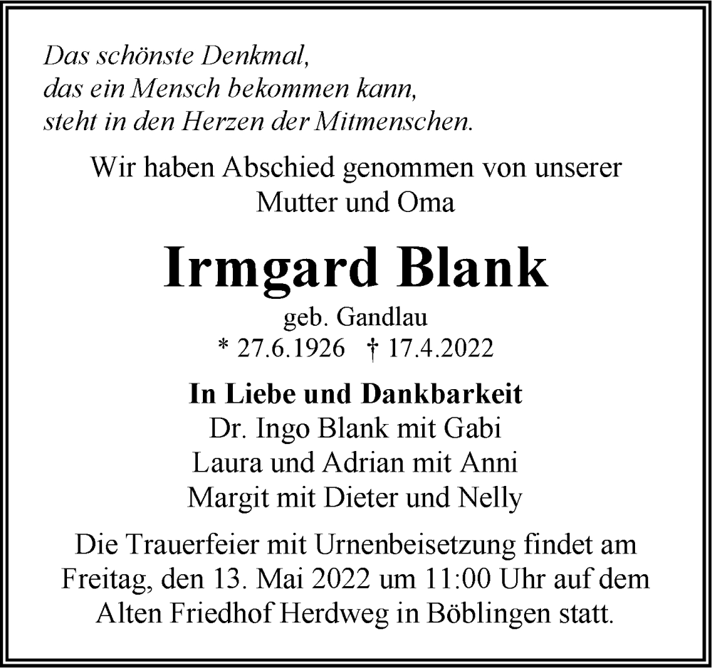 Hier finden Sie alle Traueranzeigen aus der Zeitung, die bisher für Irmgard Blank erschienen sind. Weitere Traueranzeigen, die in der Zeitung erscheinen, werden hier ebenfalls aufgelistet