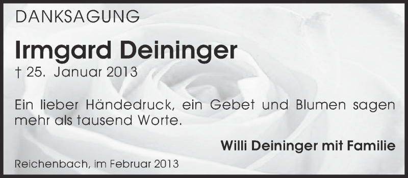 Hier finden Sie alle Traueranzeigen aus der Zeitung, die bisher für Irmgard Deininger erschienen sind. Weitere Traueranzeigen, die in der Zeitung erscheinen, werden hier ebenfalls aufgelistet