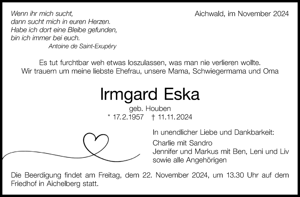 Hier finden Sie alle Traueranzeigen aus der Zeitung, die bisher für Irmgard Eska erschienen sind. Weitere Traueranzeigen, die in der Zeitung erscheinen, werden hier ebenfalls aufgelistet