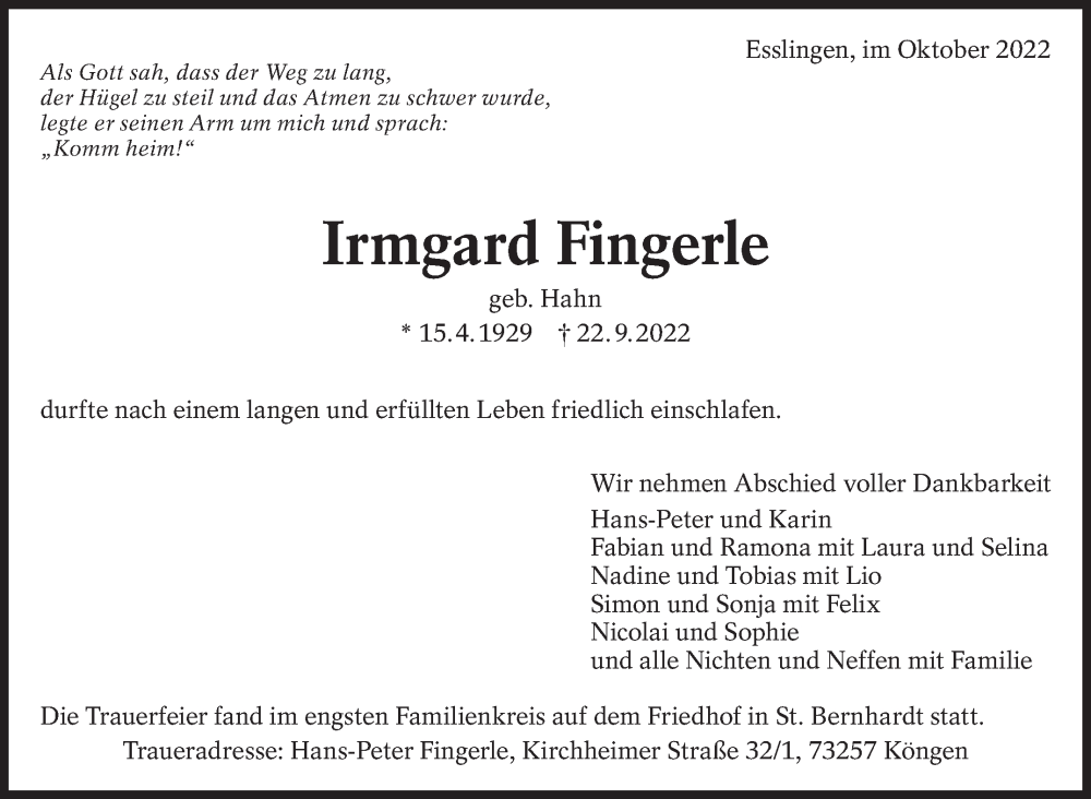 Hier finden Sie alle Traueranzeigen aus der Zeitung, die bisher für Irmgard Fingerle erschienen sind. Weitere Traueranzeigen, die in der Zeitung erscheinen, werden hier ebenfalls aufgelistet