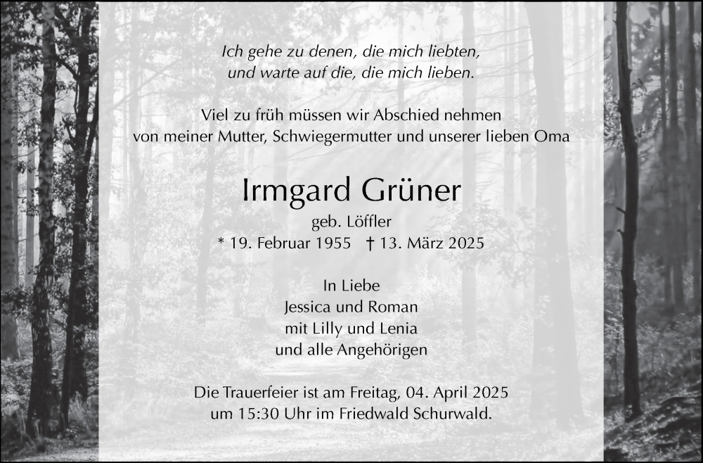 Hier finden Sie alle Traueranzeigen aus der Zeitung, die bisher für Irmgard Grüner erschienen sind. Weitere Traueranzeigen, die in der Zeitung erscheinen, werden hier ebenfalls aufgelistet