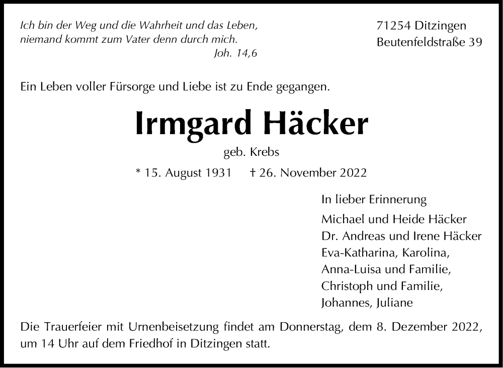 Hier finden Sie alle Traueranzeigen aus der Zeitung, die bisher für Irmgard Häcker erschienen sind. Weitere Traueranzeigen, die in der Zeitung erscheinen, werden hier ebenfalls aufgelistet