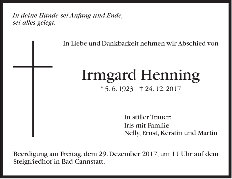 Hier finden Sie alle Traueranzeigen aus der Zeitung, die bisher für Irmgard Henning erschienen sind. Weitere Traueranzeigen, die in der Zeitung erscheinen, werden hier ebenfalls aufgelistet