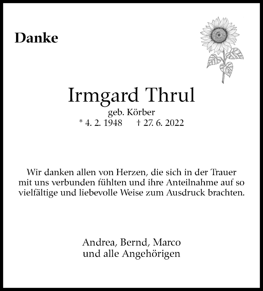 Hier finden Sie alle Traueranzeigen aus der Zeitung, die bisher für Irmgard Thrul erschienen sind. Weitere Traueranzeigen, die in der Zeitung erscheinen, werden hier ebenfalls aufgelistet