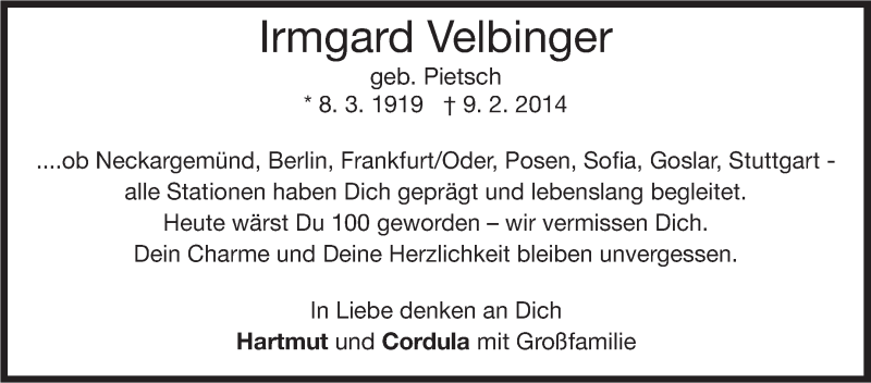 Hier finden Sie alle Traueranzeigen aus der Zeitung, die bisher für Irmgard Velbinger erschienen sind. Weitere Traueranzeigen, die in der Zeitung erscheinen, werden hier ebenfalls aufgelistet