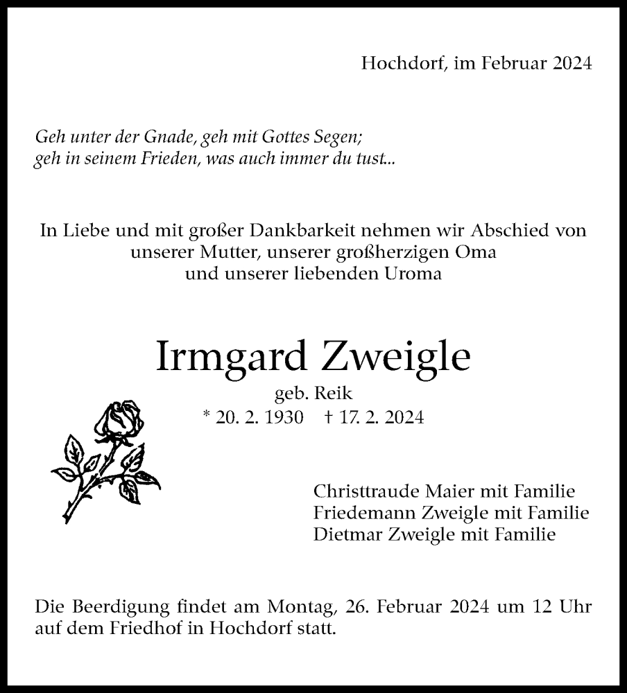 Hier finden Sie alle Traueranzeigen aus der Zeitung, die bisher für Irmgard Zweigle erschienen sind. Weitere Traueranzeigen, die in der Zeitung erscheinen, werden hier ebenfalls aufgelistet