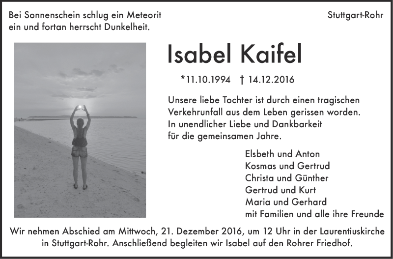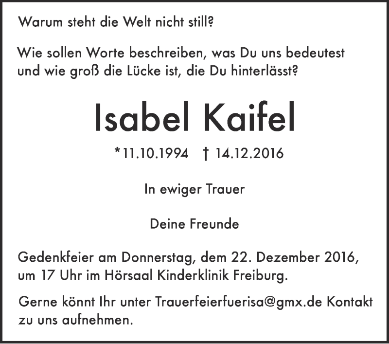 Hier finden Sie alle Traueranzeigen aus der Zeitung, die bisher für Isabel Kaifel erschienen sind. Weitere Traueranzeigen, die in der Zeitung erscheinen, werden hier ebenfalls aufgelistet