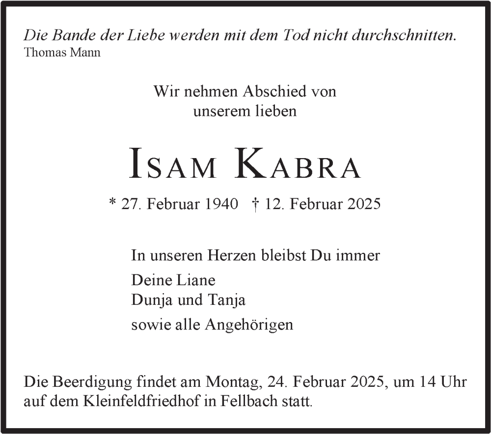Hier finden Sie alle Traueranzeigen aus der Zeitung, die bisher für Isam Kabra erschienen sind. Weitere Traueranzeigen, die in der Zeitung erscheinen, werden hier ebenfalls aufgelistet