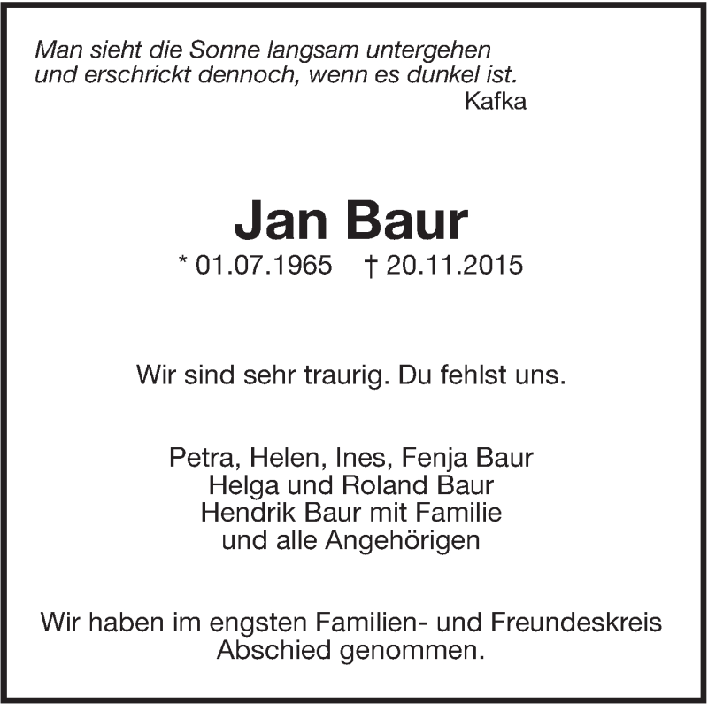 Hier finden Sie alle Traueranzeigen aus der Zeitung, die bisher für Jan Baur erschienen sind. Weitere Traueranzeigen, die in der Zeitung erscheinen, werden hier ebenfalls aufgelistet
