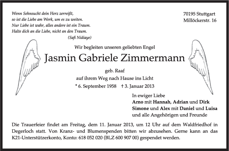 Hier finden Sie alle Traueranzeigen aus der Zeitung, die bisher für Jasmin Gabriele Zimmermann erschienen sind. Weitere Traueranzeigen, die in der Zeitung erscheinen, werden hier ebenfalls aufgelistet