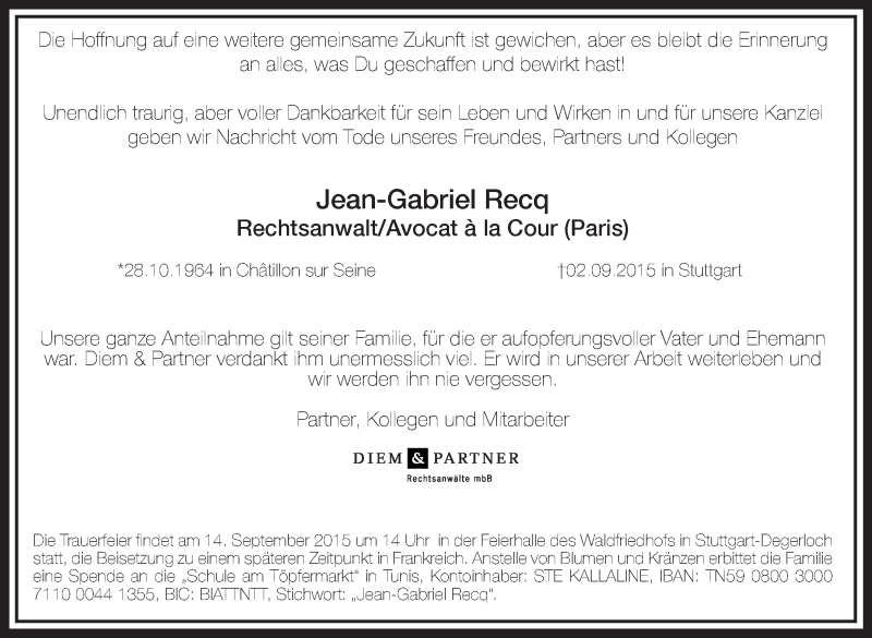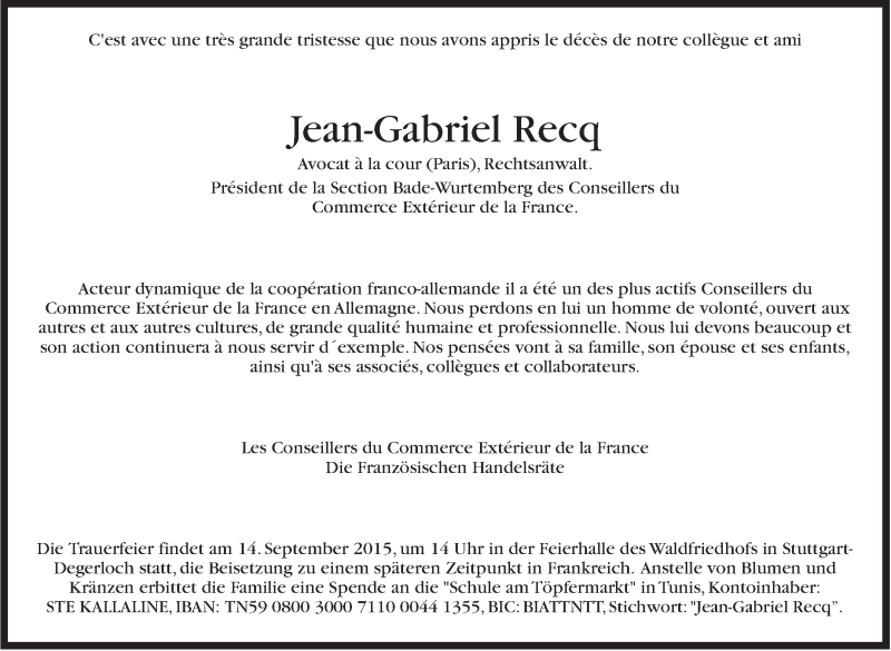 Hier finden Sie alle Traueranzeigen aus der Zeitung, die bisher für Jean-Gabriel Recq erschienen sind. Weitere Traueranzeigen, die in der Zeitung erscheinen, werden hier ebenfalls aufgelistet