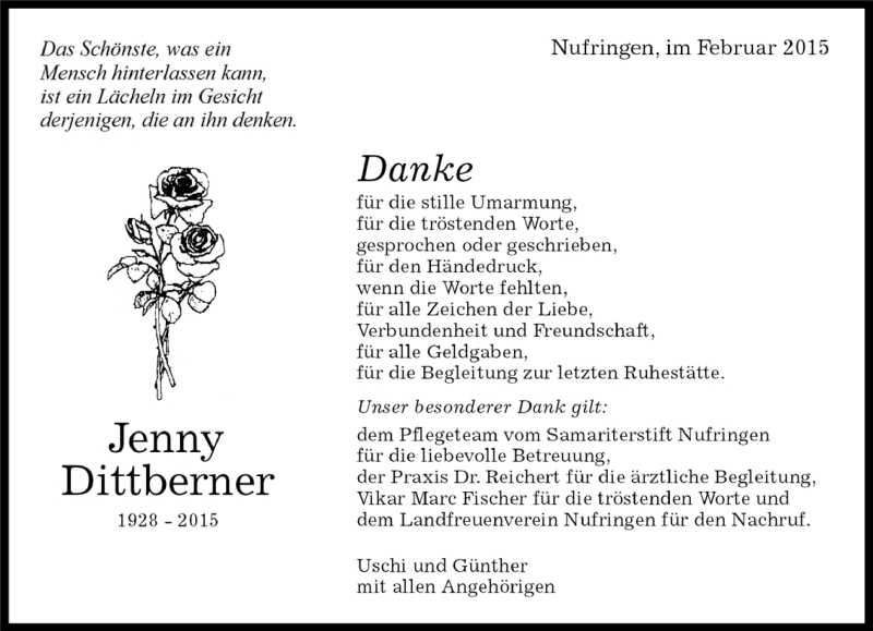 Hier finden Sie alle Traueranzeigen aus der Zeitung, die bisher für Jenny Dittberner erschienen sind. Weitere Traueranzeigen, die in der Zeitung erscheinen, werden hier ebenfalls aufgelistet