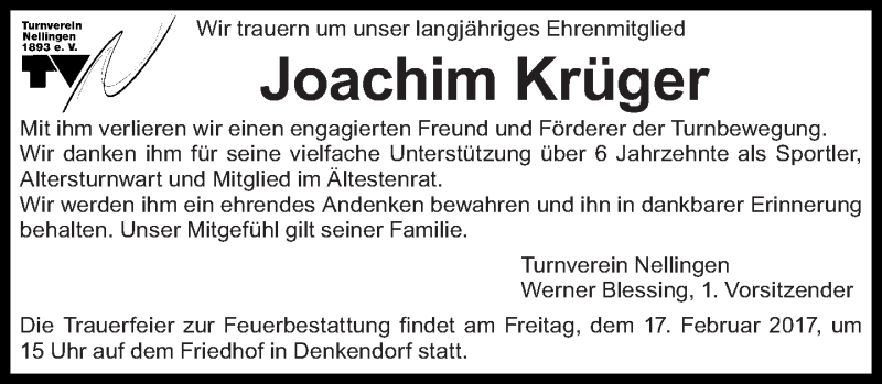 Hier finden Sie alle Traueranzeigen aus der Zeitung, die bisher für Joachim Krüger erschienen sind. Weitere Traueranzeigen, die in der Zeitung erscheinen, werden hier ebenfalls aufgelistet