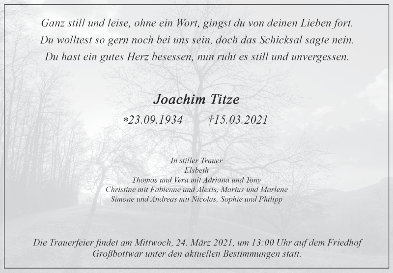 Hier finden Sie alle Traueranzeigen aus der Zeitung, die bisher für Joachim Titze erschienen sind. Weitere Traueranzeigen, die in der Zeitung erscheinen, werden hier ebenfalls aufgelistet