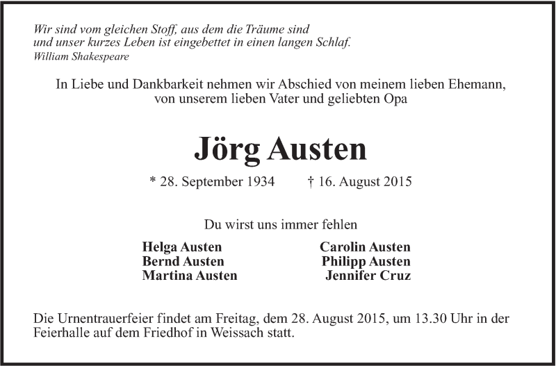 Hier finden Sie alle Traueranzeigen aus der Zeitung, die bisher für Jörg Austen erschienen sind. Weitere Traueranzeigen, die in der Zeitung erscheinen, werden hier ebenfalls aufgelistet