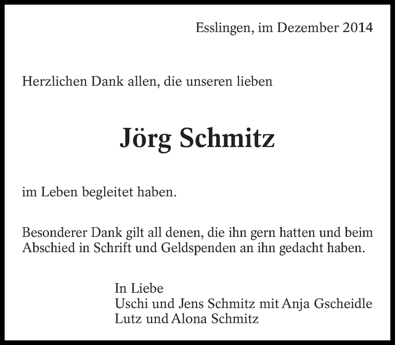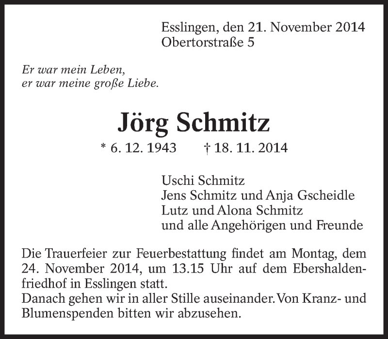 Hier finden Sie alle Traueranzeigen aus der Zeitung, die bisher für Jörg Schmitz erschienen sind. Weitere Traueranzeigen, die in der Zeitung erscheinen, werden hier ebenfalls aufgelistet