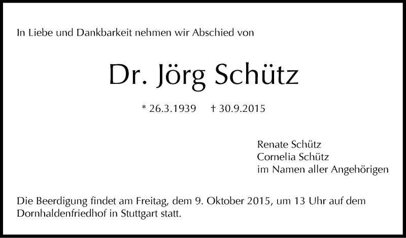 Hier finden Sie alle Traueranzeigen aus der Zeitung, die bisher für Jörg Schütz erschienen sind. Weitere Traueranzeigen, die in der Zeitung erscheinen, werden hier ebenfalls aufgelistet
